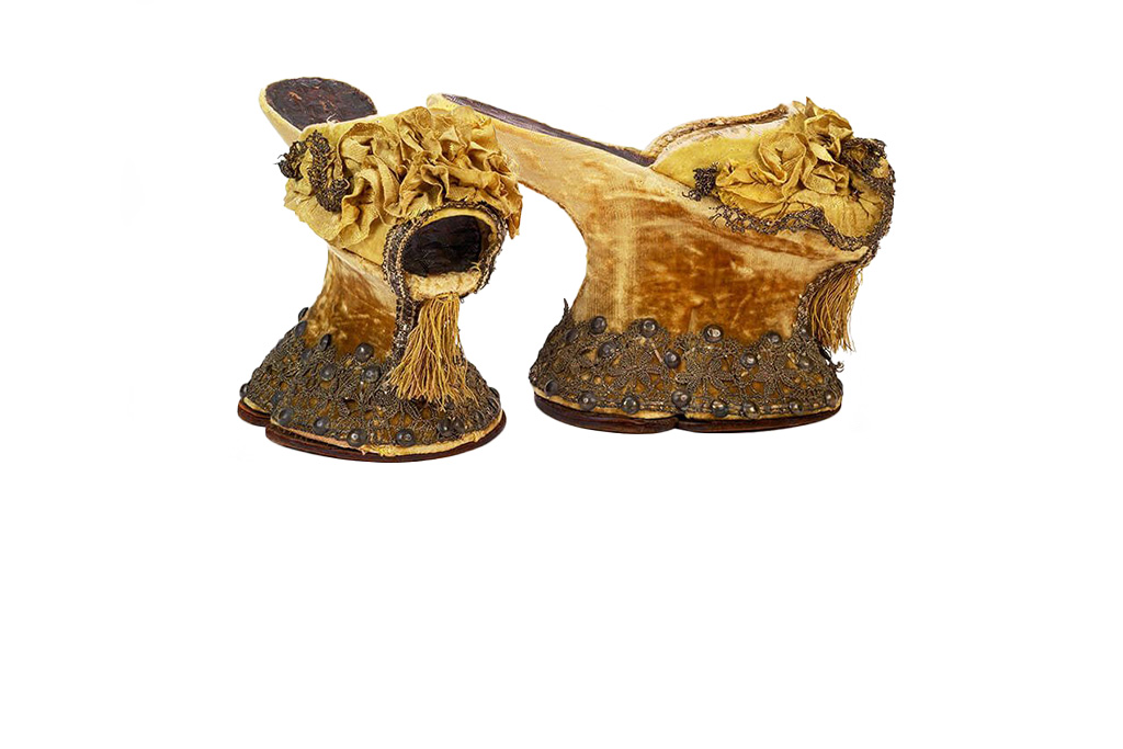Platform footwear called chopines were a staple of upper-class women's fashion in Italy and Spain in the 16th century. In Italy chopines were made of wood and worn hidden under long dresses, while in Spain they were made of cork, highly decorated and worn visible. These chopines share similarities with both Italian and Spanish styles and comes from a part of Italy ruled by the Spanish.soles.