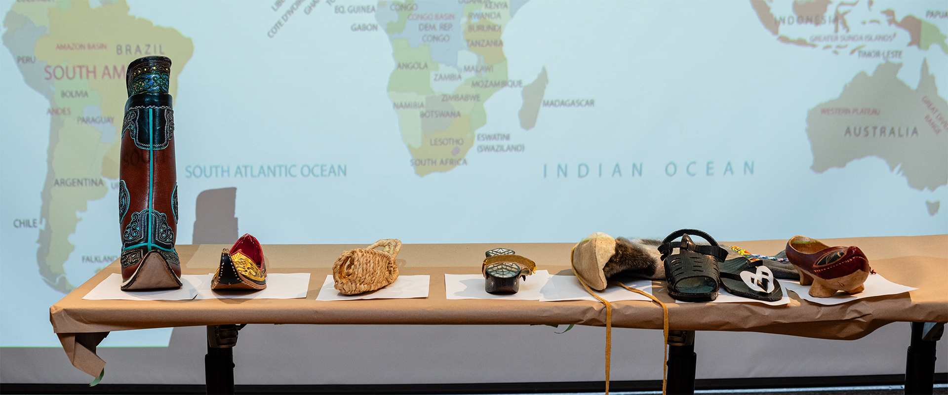 Add a sensory experience to give participants the opportunity to see and handle footwear from around the world. This sensory experience invites groups to examine and appreciate the intricate details, materials, and craftsmanship that shoe designers and makers have used throughout history, while expanding their knowledge through questions and discussion.